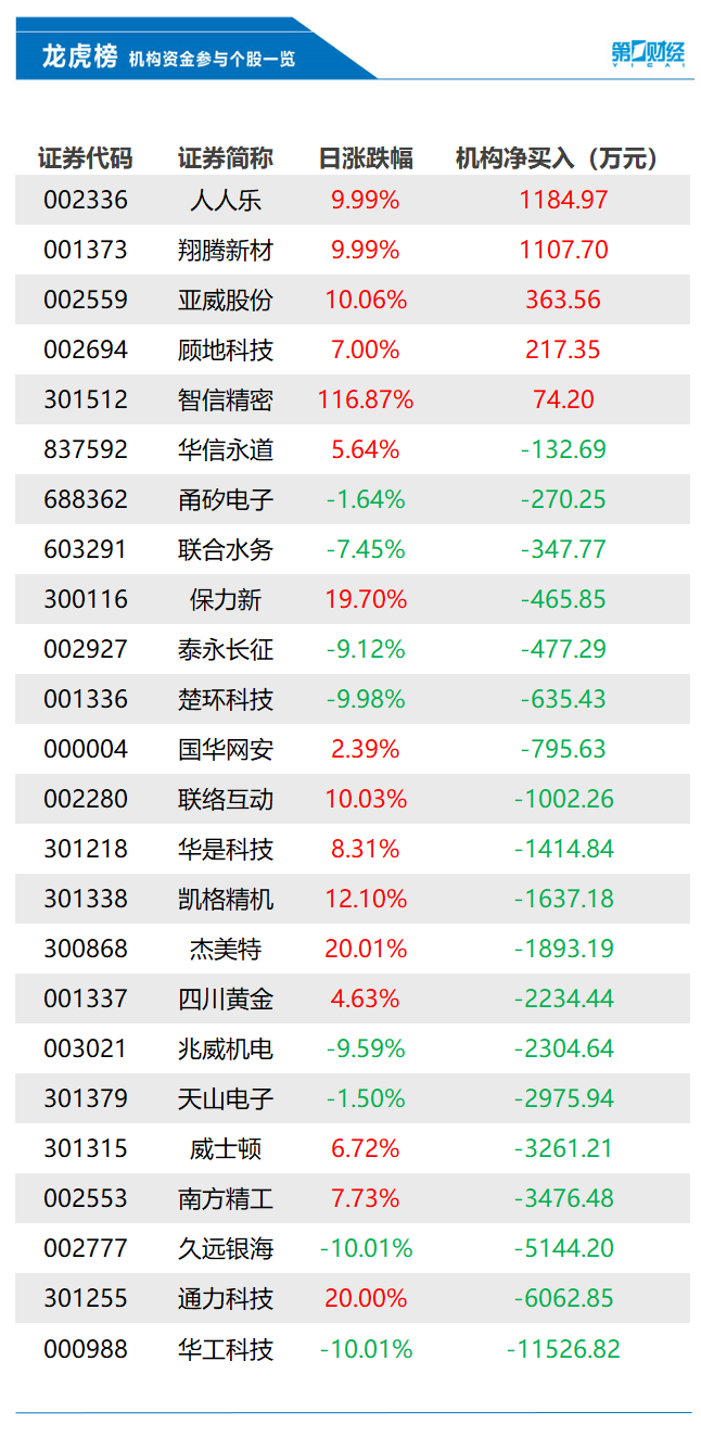 7月20日龙虎榜中,共24只个股出现了机构的身影,有5只股票呈现机构净买入,19只股票呈现机构净卖出。当天机构净买入前三的股票分别是人人乐、翔腾新材、亚威股份;当天机构净卖出前三的股票分别是华工科技、通力科技、久远银海。