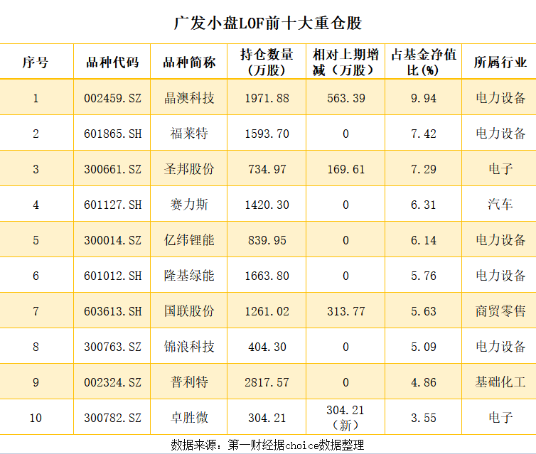 记者梳理发现,和一季度末的持仓相比,广发小盘LOF的前十大重仓股变化不大。原本排名第五位的龙佰集团退出前十大重仓股之列,电子行业的卓胜微则取而代之,排名第10位。