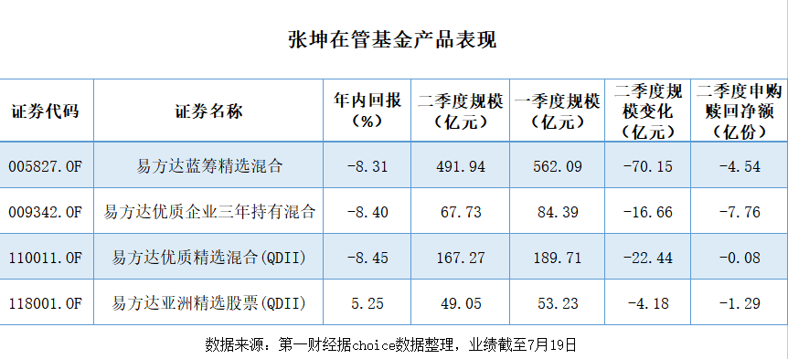 张坤在管规模缩水,主要受基金业绩拖累。Choice数据显示,截至7月19日,除了易方达亚洲精选股票(QDII)年内回报收正,为5.25%外,另外三只产品年初至今的累计跌幅均超过8%。