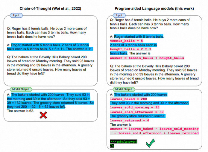 Program-Aided Language Models(程序辅助语言模型)使用 LLM 阅读自然语言问题,并生成程序作为中间推理步骤的方法。(PAL) 与思维链提示的不同之处在于,它不是使用自由格式的文本来获得解决方案,而是将解决方案步骤变为编程代码运行,提高了结果的准确性。该方法的缺点是需要较长的提示样例,通常也是一些程序代码,这样才能让 LLM 也用代码回答。