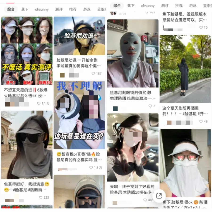 对“连指甲缝也要防晒”的年轻人来说,防晒衣、防晒帽等产品已经不能满足需求。一方面,他们更注重全方位防晒,让“武装到脖子”的“脸基尼”、防晒面罩等产品爆卖。另一方面,他们注重防晒产品美观度,腮红口罩便是代表性产品,让年轻人可以素颜出门,且拍照呈现更好效果。