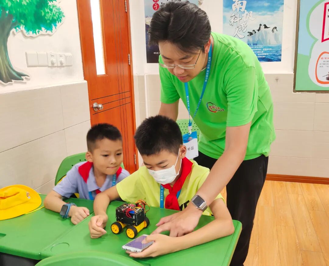 周浦镇爱心暑托班充分挖掘周浦镇区域化团建单位、公益团体等优势资源,设置了包括科创类、艺术类、手工类等课程,包括制作避障小车、了解航天航空等。
