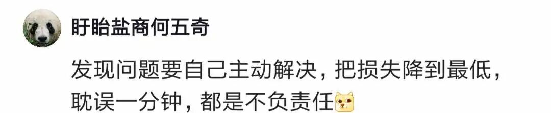 还有人说,发现问题要自己主动解决,把损失降到最低,耽误一分钟都是不负责任。
