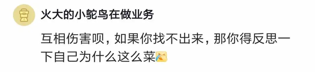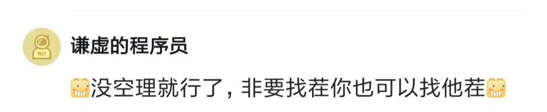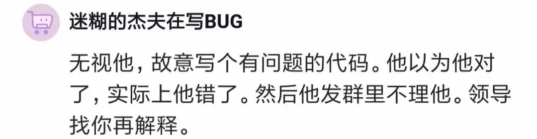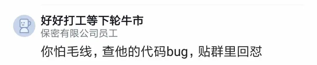有人说,也可以找他茬,查他的代码bug,贴在群里回怼,互相伤害。如果找不出bug,那就得反思一下自己为什么这么菜。