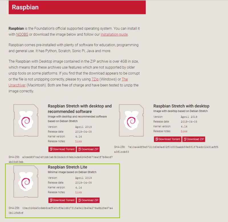 • 16GB or 32GB 的 SanDisk 内存卡(注意是以前那种放在手机上,很小的哦)• 一根最普通不过的 usb 安卓数据线(not type-c)• u 盘格式化工具(推荐使用 SDFormatter)• 系统烧写工具(Win32DiskImager)我使用的是 Raspbian Stretch Lite 这个系统镜像,这个系统是官方制作的,lite 是无桌面版的,只有黑漆漆的控制台,优点是体积小,省性能和内存。名字带有 desktop 的是有桌面 ui 的,对不熟悉 liunx 系统的朋友可能更友好,但是体积很大,占用的性能也会更高。2. 第一步下载系统镜像