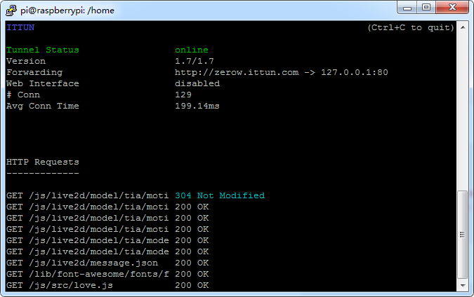 内网穿透,意思就是将内网(本地)的 web 应用通过 nat 穿透到公网上,从而让别人可以访问到。内网穿透目前主要由 ngrok 和 frp 两种,都非常好用,国内 ngrok 免费的有 ittun、sunny 和 natapp,这三个都是免费的,前面两个可以自定义域名,后面的需要 vip 版本才可以自定义域名。我这三种都试过,我发现 sunny 的 arm 版本的 ngrok 客户端在我的树莓派运行不了,ittun 的和 natpp 的 ngrok 都可以,由于需要自定义域名,我使用的是 ittun 的 ngrok_arm 版本的。这是正常运行时的截图,访问 http://zerow.ittun.com/ 时可以...