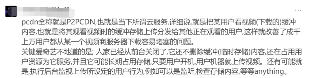 也有网友表示,爱奇艺这事做得不地道。用户都已经关机了,它还在占用用户资源为它服务,而且还可能长期占用存储,只要用户开机,机器就上传视频。