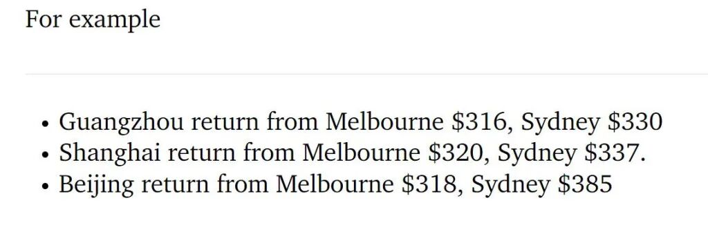 从墨尔本到北京往返318澳元,从悉尼到北京往返385澳元