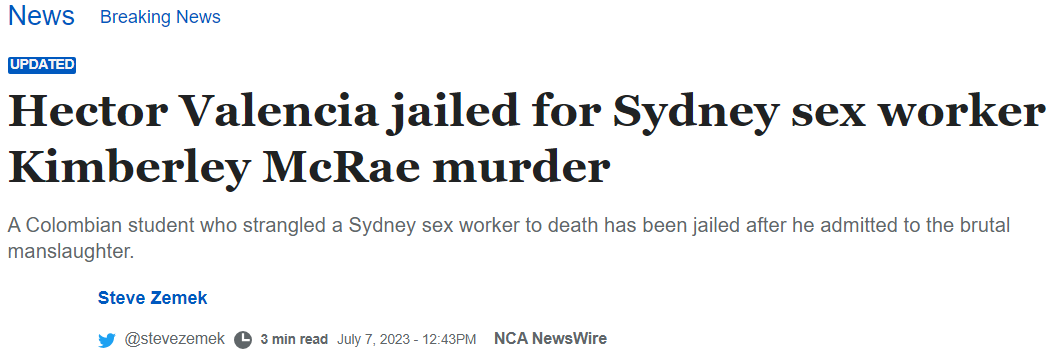 2020年1月,留学生Hector Enrique Valencia Valencia在悉尼东区公寓内爆发的一场暴力争吵中,用灯线勒住69岁Kimberley McRae的脖子,将她活活勒死。