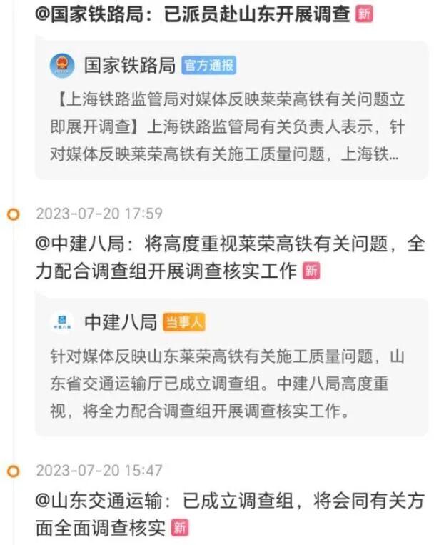随后,山东省交通运输厅回应,针对媒体反映山东莱荣高铁有关施工质量问题,山东省交通运输厅高度重视,已成立调查组,将会同有关方面全面调查核实,依法依规处理。相关调查结果将及时公布。