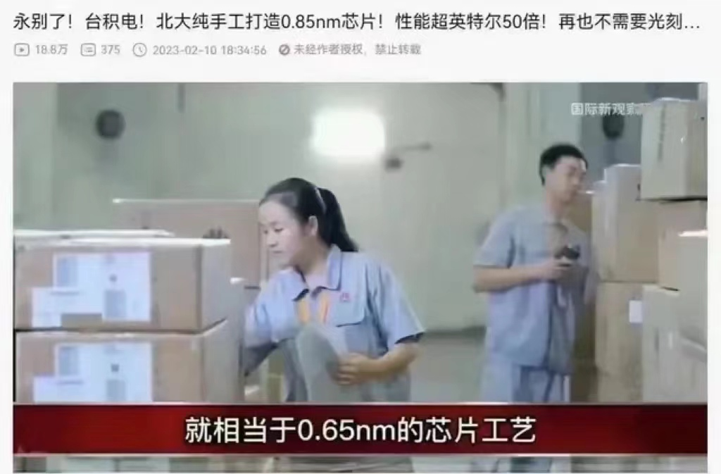 用「拜拜了!台积电!北大纯手工打造0.85nm芯片!性能超英特尔50倍!」之类的哗众之论,营造芯片产业大跃进的自我膨胀氛围。