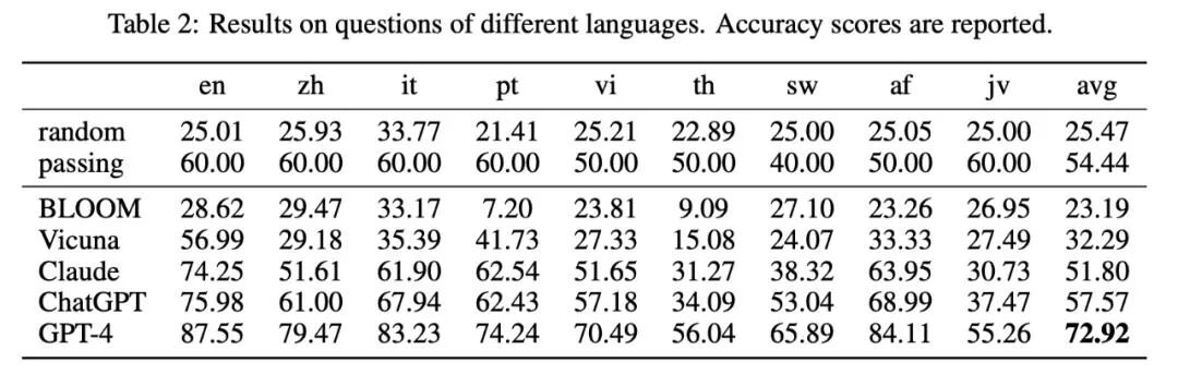 ▲阿里达摩院的测试显示,GPT-4在多语言能力上仍是最秀的那一个。