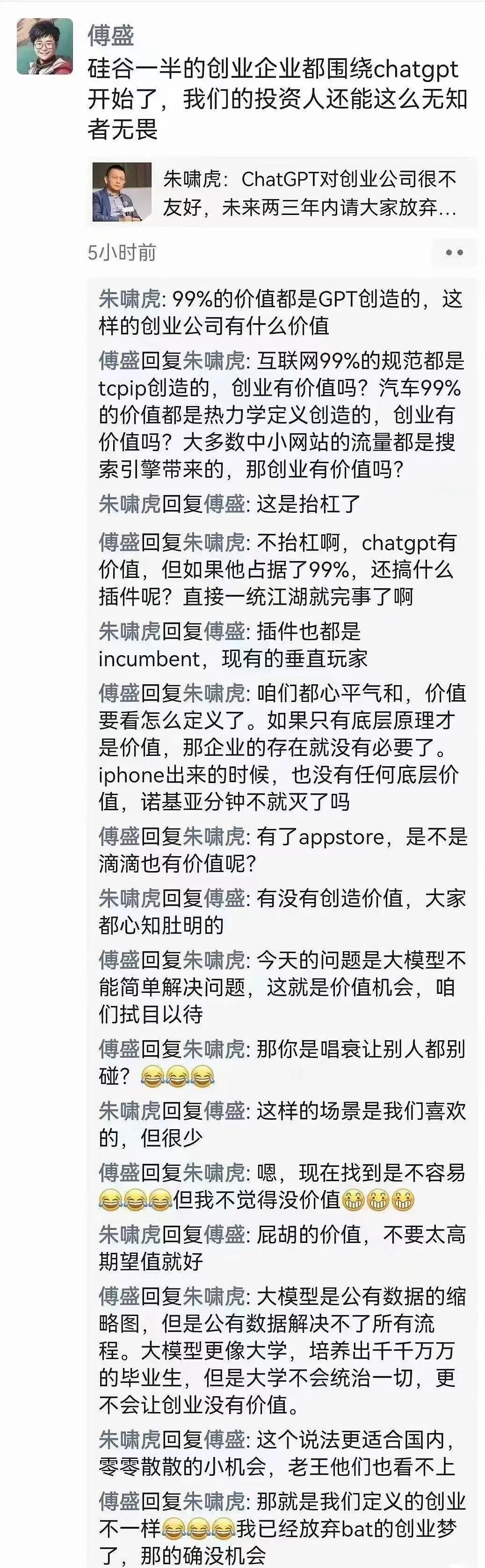 ▲傅盛跟朱啸虎前不久在朋友圈激辩大模型创业。