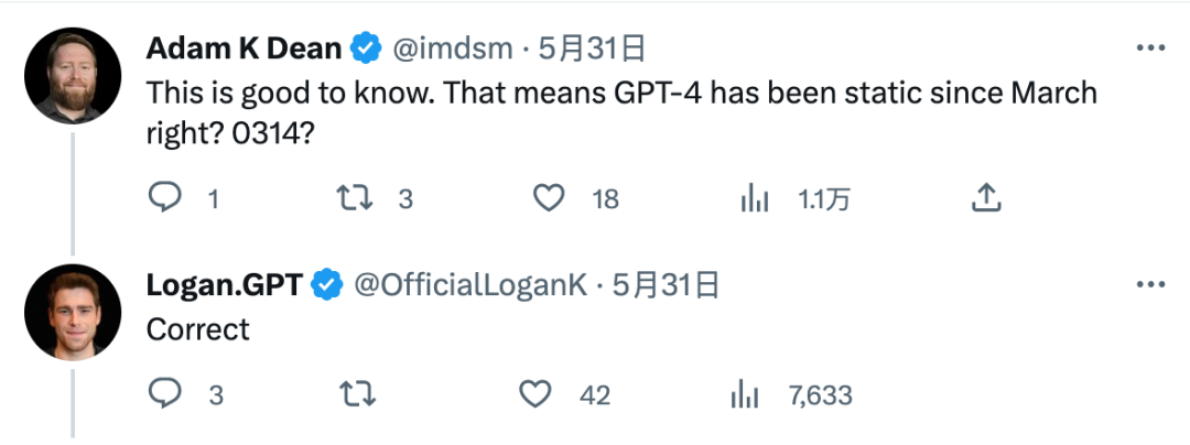 网友问他,GPT-4大模型本体自从3月14日发布以来都是静态的,对吧?