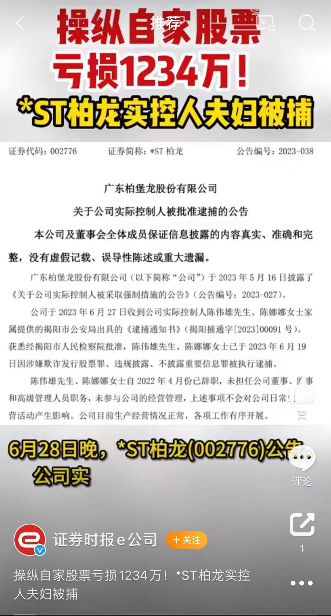 近日,柏堡龙(*ST柏龙)发了个公告,俺家老板和老板娘被抓了。