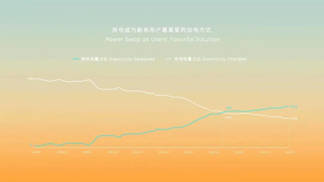 于长安出发,经匈奴,西行大宛辗转康居,最终抵达大月氏,不辱使命。张骞通西域,开辟了历史上最早的丝绸之路。公元 2 世纪后,伴随着汉唐盛世的到来,丝绸之路达到鼎盛时期。丝绸之路成为了东西方贸易、文化交流的重要桥梁,也成为了中国第一条通向世界的道路。两千年后的今天,我们早已经告别了「古道瘦马」的过往。步入新能源汽车时代,蔚来用自己独有的方式重新谱写了这条传奇的陆上丝绸之路。就在 NIO Power Day 的前夕,蔚来正式官宣了「丝绸之路」加电线路贯通的消息,从西安向西出发,途径莫高窟、天池、赛里木湖,最终抵达霍尔果斯,全程 3133 公里,总共布局 33 座换充换电站。古今时空交错,一段富有传奇色彩的 Power Journeys 拉开了今年 NIO Power Day 的序幕。NIO Power 的核心在于可充(Chargeable)、可换(Swappable)以及可升级(Upgradeable)。秦力洪把蔚来的充换电布局作为了今年 NIO Power 的开端。以点到面,家充一直以来就是蔚来用户最重要的充电场景之一。截至目前为止蔚来的家充桩用户已经突破了 19.75 万名,19.75 万名的家充桩用户在蔚来汽车总体保有量里占据了 50%的比例。秦力洪透露,蔚来未来将会坚持直流家充桩的路线,让直流充电逐渐取代交流充电,蔚来为用户提供 20kW、11kW 以及 7 kW 三种直流充电桩选择。秦力洪认为,直流充电桩的优势不仅体现在补能速度,更重要的是可以在车身上减少一个接口,达到为车身减重的效果。把目光放到公桩业务,蔚来一直以来是中国布局公共充电桩数量最多的汽车品牌。蔚来当前累计开放多达 1.67 万根公共充电桩,布局高速超充站 150 座(合计 459 根超充桩)。有趣的是,蔚来给出了一份旗下充电桩的使用数据。数据显示,蔚来车主使用自家充电桩的比例仅占到 20%,服务其他品牌车主的比例高达 80%,其中比亚迪(19.2%)、特斯拉(13.1%)的使用率占到了前三甲。秦力洪谈起了在 NIO Day 2022 发布的 500kW 超快充桩的布局情况,在今年 4 月 17 日首支 500 kW 超充桩上线以来,94 天的时间累计布局 488 根。未来百天内,蔚来的超快充桩计划达到 500 根的数量。相比市面上某些对超充桩布局含糊其辞的车企,蔚来一直主打的态度是踏实肯干,不说空话。换电一直都是蔚来的「金字招牌」,秦力洪从充电过渡,谈起蔚来的换电业务。蔚来的换电业务在今年取得的亮眼的成绩,在今年的春节期间,蔚来开放春节高速免费换电服务,1 月 13 日-1 月 20 日,高速免费换电次数突破 11 万次; 2023 年 7 月 14 日,蔚来的换电次数正式达成了 2500 万次。庞大的换电量级离不开换电站的强力支持。蔚来换电站的建设足够迅速,在今年的 6 月 25 日,蔚来换电站刚刚突破 1500 座,而在 NIO Power Day 当天,蔚来的换电站总量已经达到了 1564 座,预计下周能够突破 1600 座。秦力洪进一步透露了换电服务的最新情况,截止 NIO Power Day 前,蔚来的总换电次数达到 25,334,943 次,平均 1.6 秒的时间就有一台蔚来汽车满电出发。有意思的点还在于蔚来使用换电补能的用户渗透率。根据蔚来给出的数据显示,在 2022 年开年之际,蔚来车主的换电渗透率首次突破 50%,而在今年的 6 月份,这个数字来到了 60%,换电已经成为了蔚来车主最爱的补能方式。当然,随着换电用户渗透率的提升,蔚来也主动将电池服务进行了升级。蔚来首先对换电自动泊车做了优化,在今年的第三季度,蔚来将会支持一把泊入换电站功能,秦力洪透露,通过一把泊入功能的更新,蔚来车型的换电速度能够提升大约 40%。同时,蔚来对二代换电站的效率进行了优化,在 NIO Day 2022 发布会上,蔚来通过降低三代站的平台高度(100mm)、三工位协同设计以及优化电池流转路径等方式,将三代站的换电时间减少了 20%。而现在,蔚来的第二代换电站将会全面提速,整体的换电速度能够达到三代站的水平。在今年的第四季度,蔚来还将带来「换电不断电」功能升级,在换电过程中,换电站将会保持处在换电过程中的汽车供电,为车主提供送风、影音娱乐等功能,解决用户的换电痛点。重头戏出现在蔚来的电池灵活升级政策调整上面。蔚来主动降低了电池升级的颗粒度,即日起在全国范围推出电池包日租制。蔚来将为选择电池升级的车主提供 3 种付费方案,50 元/日、880 元/月以及 9800 元/年。2021 年,蔚来正式推出了电池升级服务。在今年的 7 月份,蔚来电池升级服务的使用次数仅有 19000 次。不过这个数字,在这之后突飞猛进,截至今天的 NIO Power Day,电池升级服务已经超过了 80000 次。在降低电池升级颗粒度之后,蔚来认为电池升级服务将会迎来爆炸式增长。秦力洪认为,电池包日租制可以降低电池包升级的门槛,吸引更多的车主选择电池升级服务。当电池包升级的需求大开,用户对于电池租用服务的接受度会提升,这为蔚来之后「只租不卖」的 150 度固态电池提前铺好了道路。不过,尽管蔚来为 150 度固态电池预热已久,但固态电池上车的难度显然已经超出了蔚来内部团队的预期。据 36氪独家报道,蔚来将会推迟自制电池的量产,并且放缓电池设备的采购,电池自制的阻碍以及资金紧张,预计也波及了 150 度固态电池量产上车的进度。尽管没有 150 度固态电池的身影,但蔚来还是在 NIO Power Day 上发布了一款全新的充电产品——20kW V2G 双向充电桩。全新的 V2G 充电桩除了能够为车辆进行快充补能,还增加了放电功能,电动车在电网负荷低时吸纳电能,在电网负荷高时