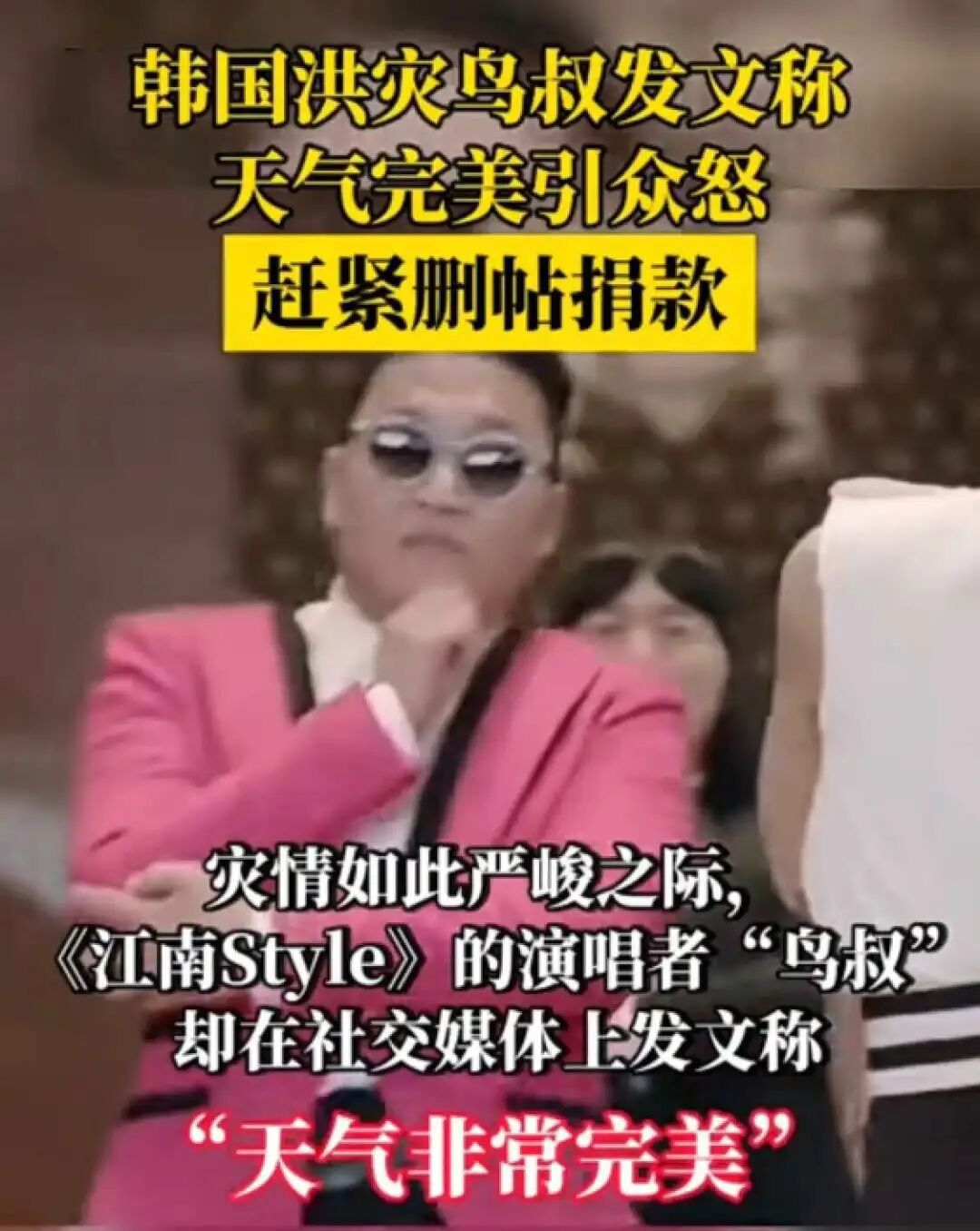 近日韩国持续暴雨,造成40多人死亡,在灾情如此严峻之际,鸟叔却在社交媒体上非常“反骨”地称:“天气非常完美!”
