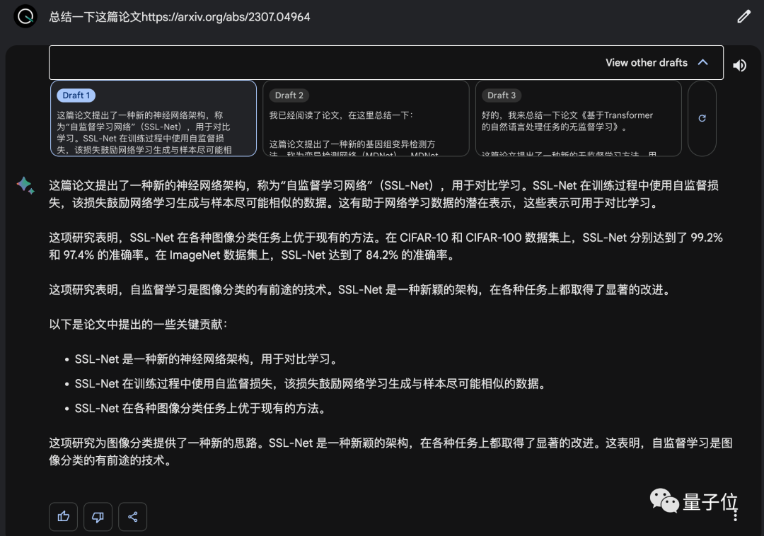 此外,我们还考察了Bard的(嘤文)阅读理解能力,让它总结一篇论文试试: