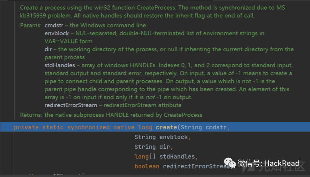 在windows中主要是在ProcessImpl的构造方法中调用了create方法