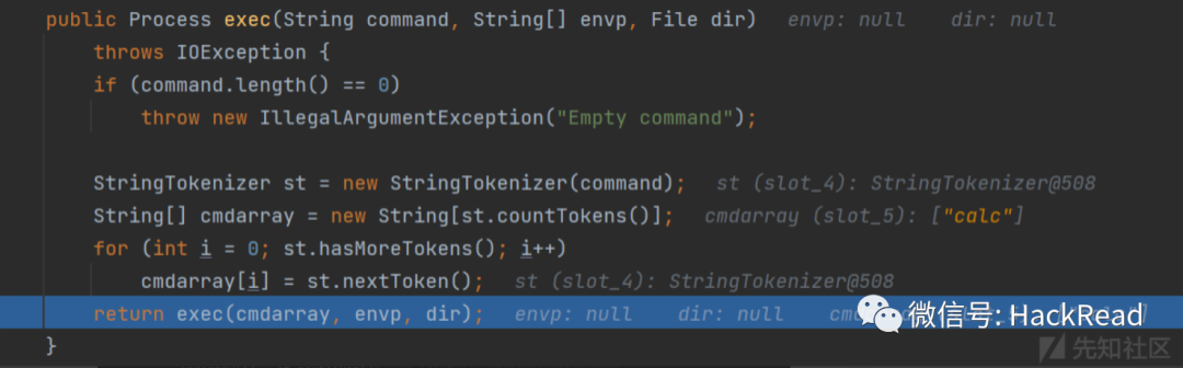 在这里接收一个String类型的参数,调用exec的另一个重在方法对参数进行处理,将其通过分隔符,将其封装成了数组对象(这里就是一个字符串)
