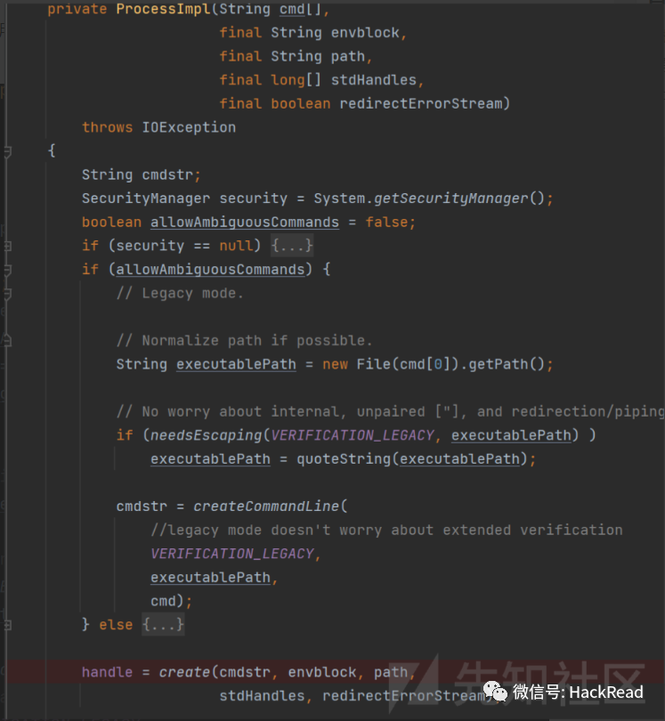 ProcessImpl类的构造方法将会调用create方法执行native方法进行命令执行