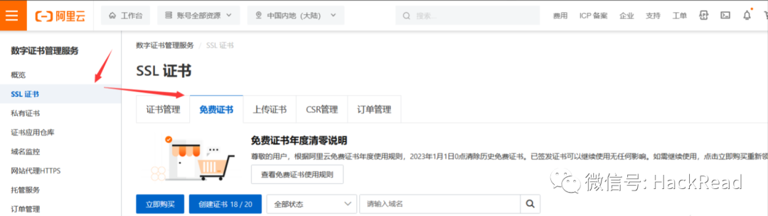 首先,去申请一下来一个SSL证书,这里阿里云可以免费申请