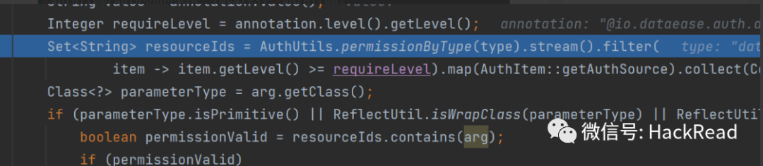3、看看他的AOP切面代码中是如何做的鉴权,AuthUtils.permissionByType(type)方法前的代码逻辑在第三个漏洞中已经分析过,在permissionByType方法中,获取这个用户对应的level级别可以查看的用户信息