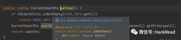 9、查看这个USER_INFO常量,ThreadLocal,他是一个线程局部变量的值,当用户发送一个请求过来,这个请求就是一个线程,线程局部变量中存在了CurrentUserDto对象,就可以从请求中拿到CurrentUserDto对象,再通过CurrentUserDto对象的getIsAdmin方法返回一个Boolean值判断是不是管理员
