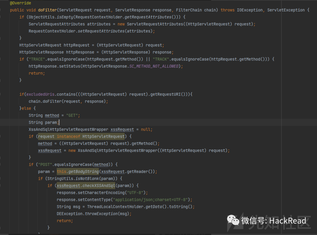 2、过滤器的主要代码放在doFilter方法,看看这个过滤器doFilter方法做了什么,先将ServletRequest转为HttpServletRequest,再传入XssAndSqlHttpServletRequestWrapper类的构造器进行实例化,再通过checkXSSAndSql校验请求参数