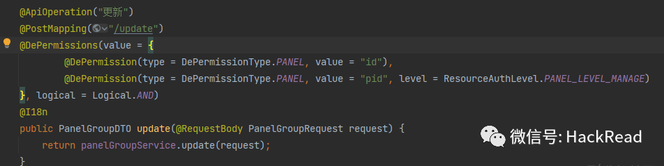 18、普通用户的level值是满足这个level的,但是这里要同时校验两个DePermission,另一个DePermission配置的level属性值是5,普通用户的level小于这个level,也就是说,普通用户是没有权限调用这个update方法的