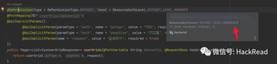 7、此时requireLevel是3,会提取出level大于等于3的数据集,判断请求过来的/userGrid/{datasetId} 的datasetId在不在level大于等于3的数据集中,而值为0这个datasetId刚好能满足条件