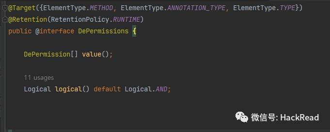 3、这里使用的是注解方式,即在需要使用切面管理的方法上配置AOP注解(这里就是@DePermissions注解),AOP注解方法的定义需要声明@Retention、@Target,表示这是一个AOP注解