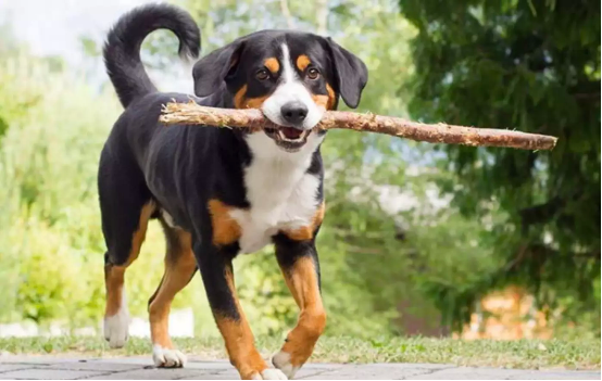 例如,图像内容为一只狗叼着一根棍子。