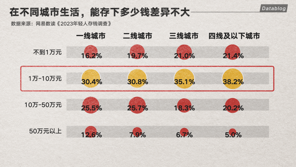 让人比较意外的是,不同城市大家的存款区间分布并没有显著的差异。即便是在一线城市,不到 10 万元的存款也是主流。