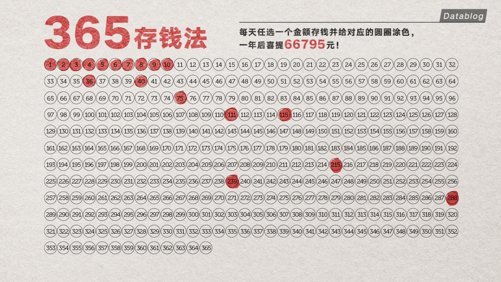 互联网上流行了很久的“365 存钱法”,是让人每天从 1 到 365 中任选一个金额存钱,在数字不重复的情况下,坚持一年,就能喜提 66795 元存款。