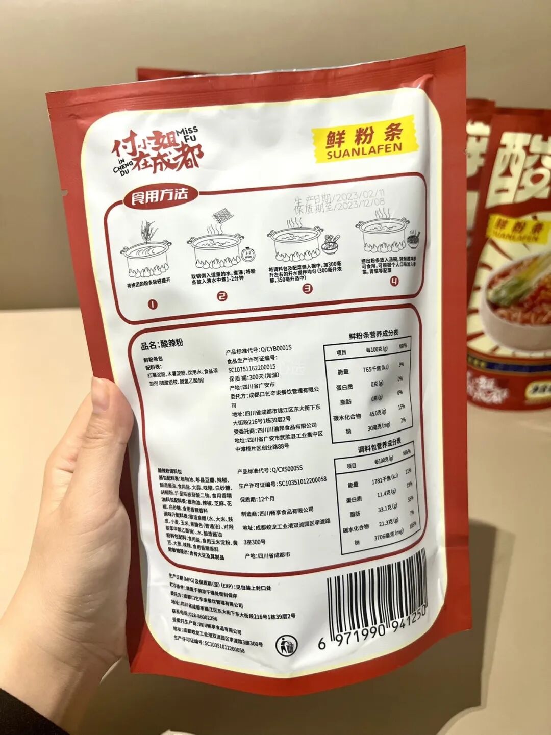 秘制配料丰富 让你一口回味 成都!!!付小姐这款酸辣粉共有4包调料,酱包、油料包、调味汁包、粉料包;每一个料包都是独立的小包装,干净卫生。