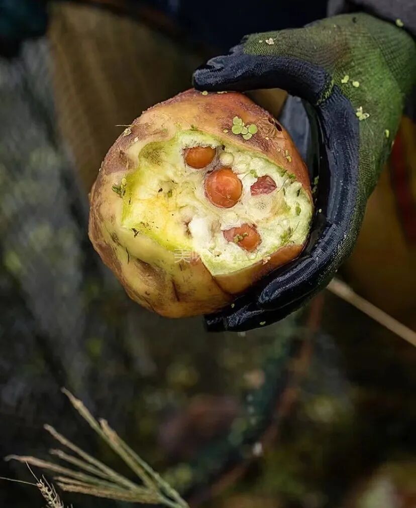 要获得芡实,师傅们在硕大的叶片下🌿顺着茎秆摸索藏在水底的鸡头苞。通过外皮颜色、个头大小、软硬手感,挑选合适成熟的✔️用自制的竹刀摸、拔、切、入篓,一气呵成。再经过机器去壳,当天放入冰柜冷冻保鲜保存❄️
