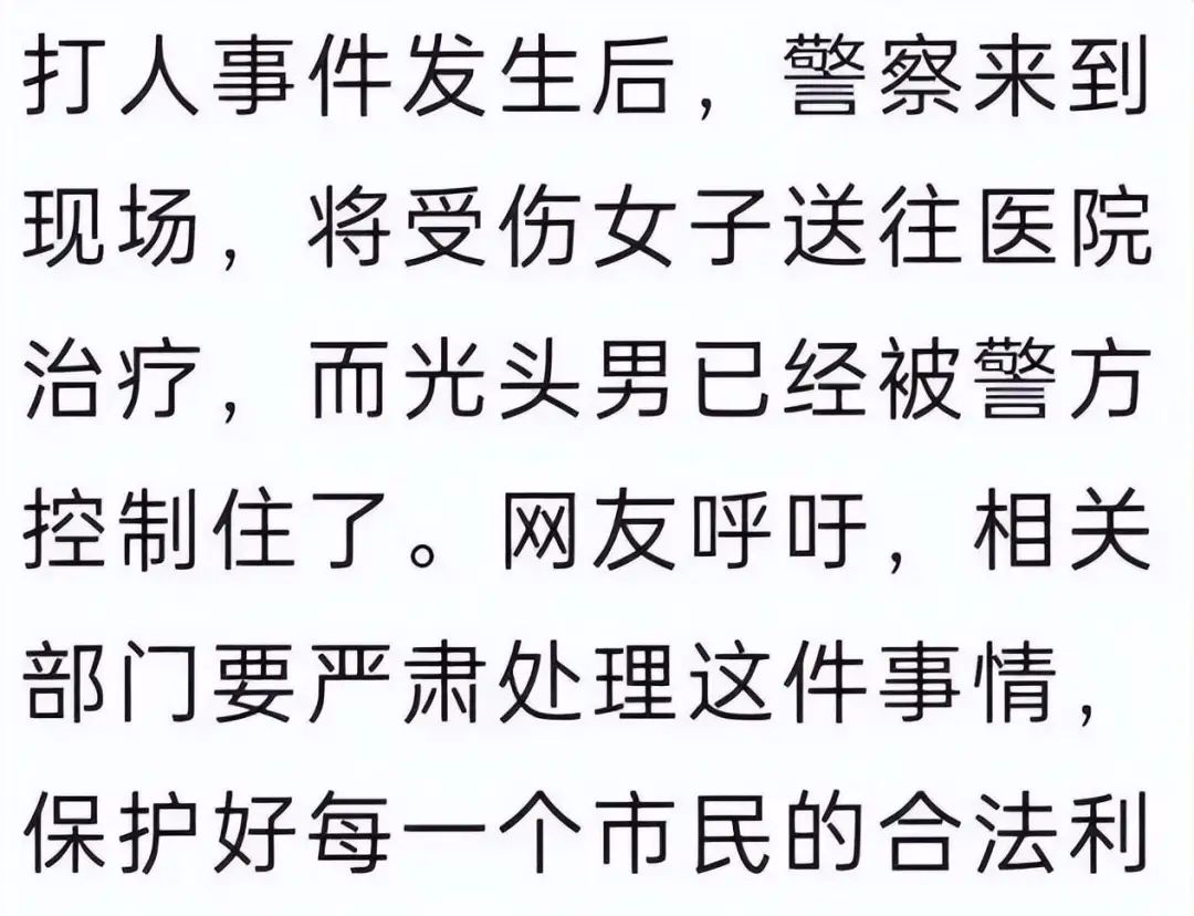 随后,警察来了,把光头男控制住,同时把女子送往医院。经过医生检查,女子的牙齿被打掉了两颗。事情就是这么个过程,具体的处理办法还需要等警方的通报。不过可以肯定的是,光头男的行为已经是故意伤害了,如果女子追究的话,大概率是要坐牢的。