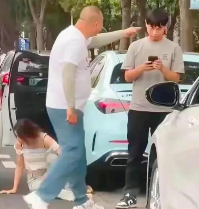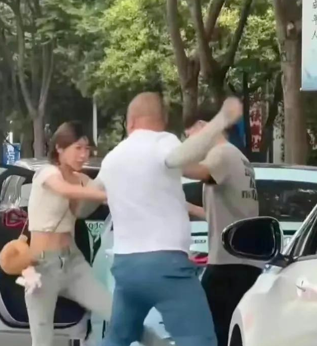 这些不好听的话直接点燃了光头男,光头男率先动起手来,他推了女子一下。这个女子看到光头男动手,也选择还手。不过女子和光头男的体型差距真的太大了,还手不成,还被光头男一拳打到嘴上。被打倒在地的女子一时间都动不了身,这个时候和女子同车的一个男子站出来,拿起手机报警。
