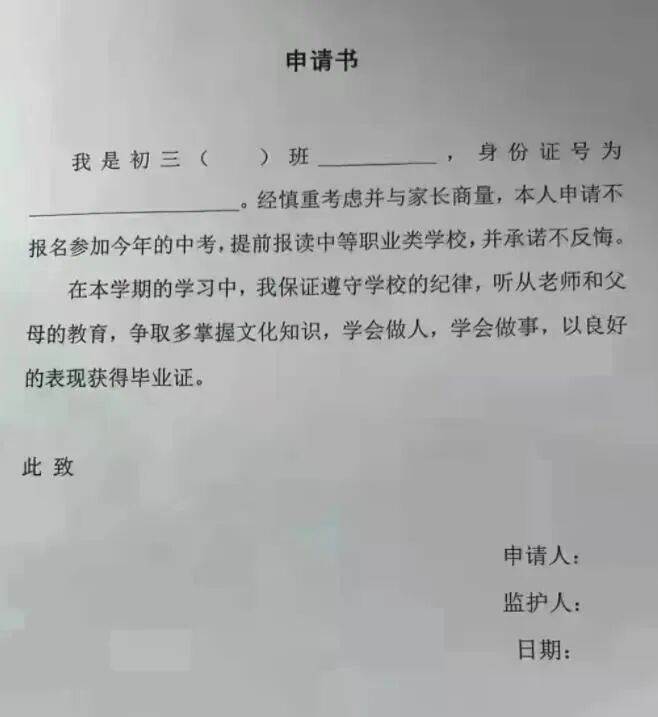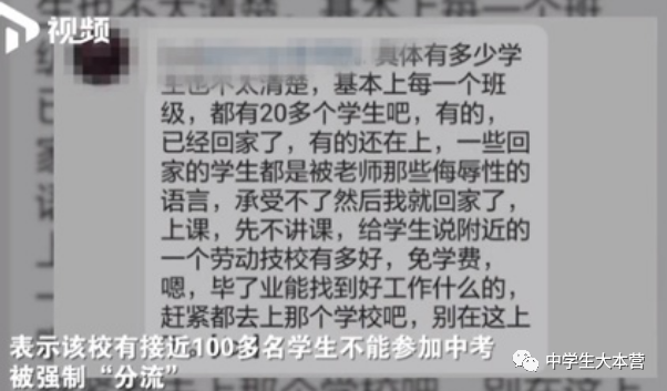 分流很可能提前把40%的孩子定义为“未来的低收入者”,让他们失去获得更好教育资源的机会,这将阻碍共同富裕的实现。前段时间,我在网上看到一个热搜,内容是“江西某中学学生被老师要求弃考”。说是江西南昌有一位初中老师,在中考前夕,暗示让学生别参加中考,否则很可能拿不到毕业证。十几岁的孩子知道什么,听老师这么一吓唬,也没跟家长沟通,就果断弃考了。等到孩子父母知道后,真的是无奈又痛心,找到媒体痛诉,认为这是在剥夺孩子中考的权利。说实话,老师在中考前劝退孩子的情况,其实并不是特例。评论区很多网友也都见怪不怪:这种情况在全国各地都发生过,网上也争论得也比较厉害。我是觉得无论孩子考得上考不上,参加考试是正常的权力,不应该连机会都不给。2019年,据第一现场报道:段先生的儿子在宝安料坑学校读初三,成绩不好,被老师要求写《自愿放弃中考申请书》。上半截字迹较工整的,是儿子按班主任祝老师的意思抄写的,空出了身份证号、学生签名、班主任签名和家长签名的位置。家长说,他们知道自己孩子成绩不好,中考也不一定能考上好学校,但孩子的努力他们看在眼里,孩子想参加中考的权利,不该被剥夺。段先生从孩子那得知,孩子所在的班级,有七八个孩子被要求抄写这份申请书请家长签名,听说其他班也有。而学校负责人说,无论是家长还是老师,都没有反映过学生被要求“自愿放弃中考”的情况。而中考成绩如何,也与老师考核并不挂钩。老师则承认,让学生抄写申请书,请家长签字,是他自己的主意,没有跟学校汇报,还表示这只是一种激励措施。同样是2019年期间,山东东明万福中学初三学生家长爆料,称其弟弟不能参加中考,并表示该校有近100多名学生不能参加中考,被强制“分流”据悉,被分流的主要是一些学习成绩差的学生,老师会根据他们的学习成绩,让他们去报考别的学校,主要是技能类学校该校老师还扬言称:分流的学生不能参加中考,且是教育局规定的一项不可剥夺的权利