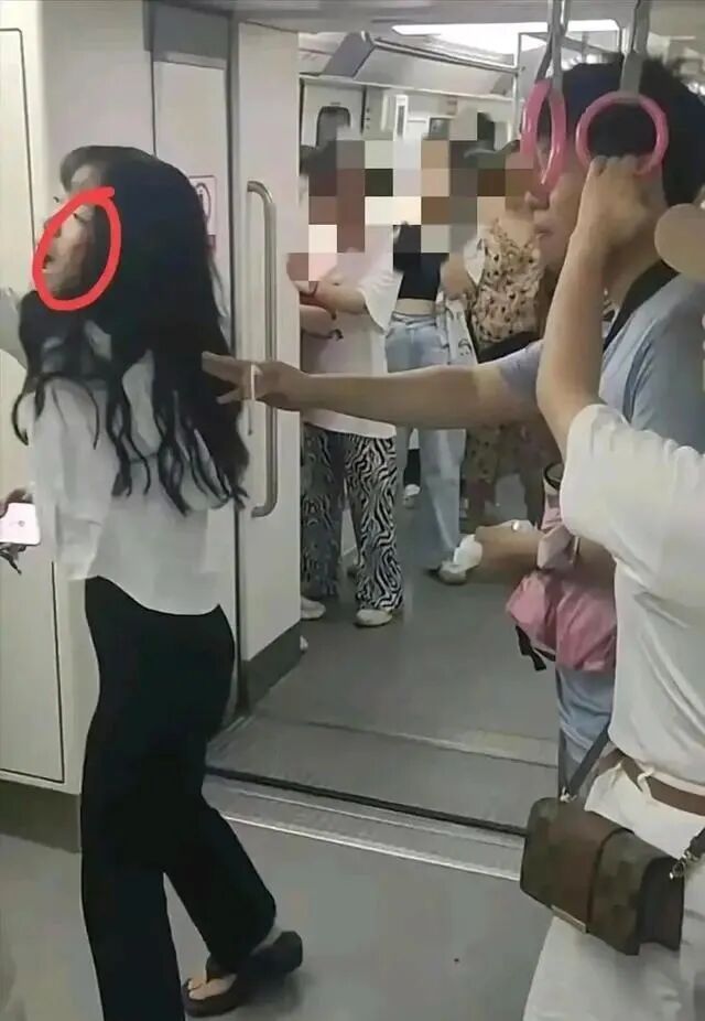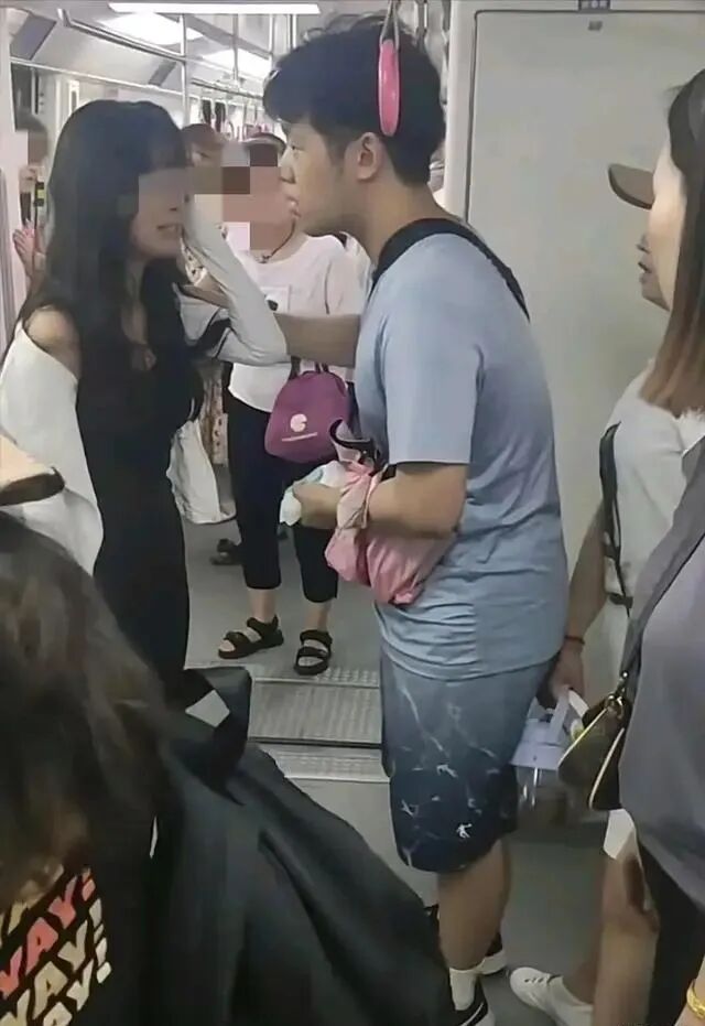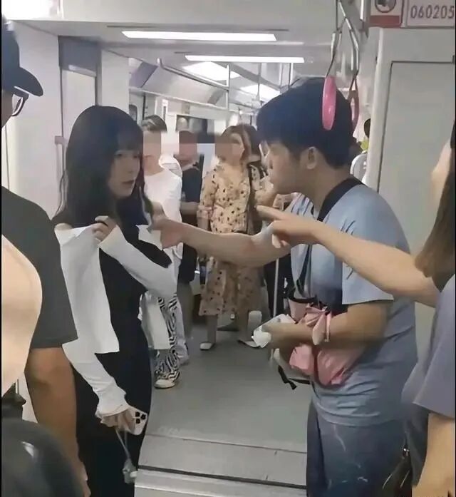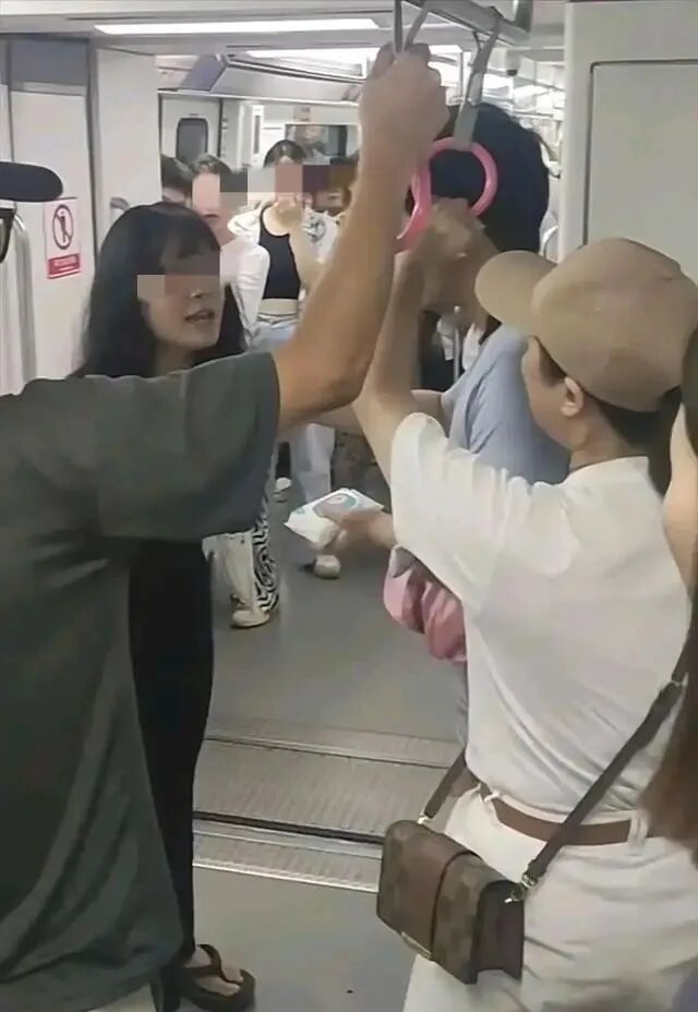 不知所以然地,看到这场景,或许还以为这是一家婆媳之间引发的矛盾呢!原来,站在中间劝架的男子和戴帽子的这位女士是母子关系,其中这位年轻的女子只是地铁上的一位乘客,他们素未相识。