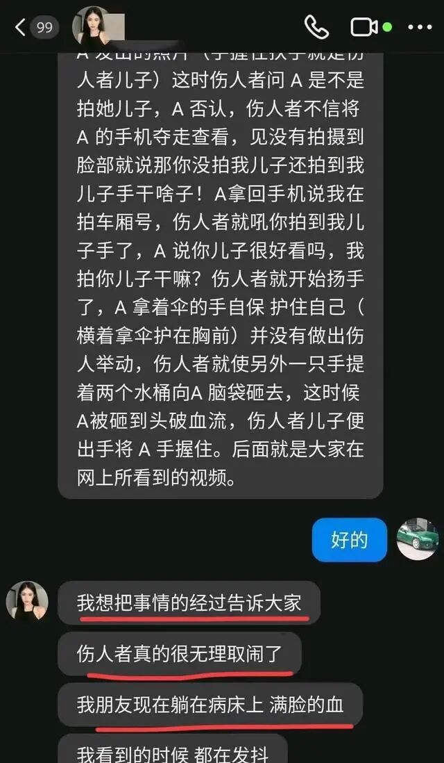 女子说道:“你儿子很帅吗”?或许就因为女子的这一句话,把这位母亲给得罪了!只见她突然要伸手打这女子。而女子也意识到了,就及时用手中的防晒伞护住自己的胸部,没想到,该中年女士不依不饶的,转手就用拎着的两个水杯朝女子的头部砸去!