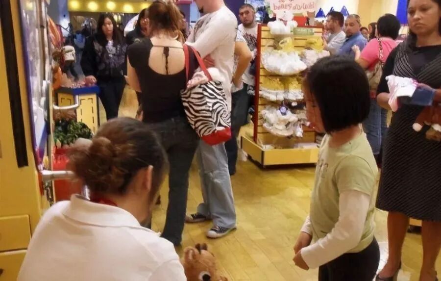 一次在商场上小女孩走到玩具店,看到一款喜欢的毛绒玩具,爱不释手,一直央求妈妈给她买。