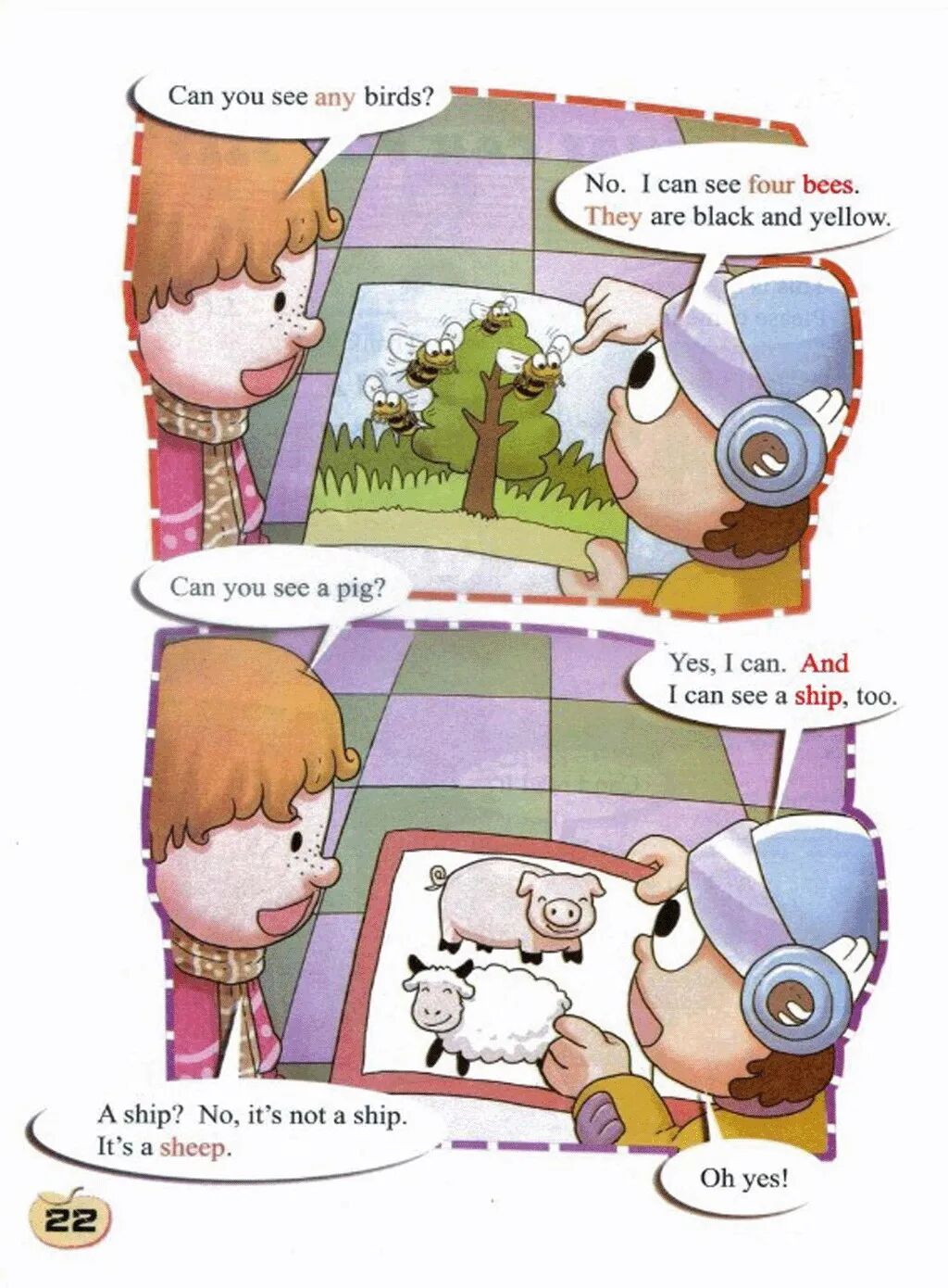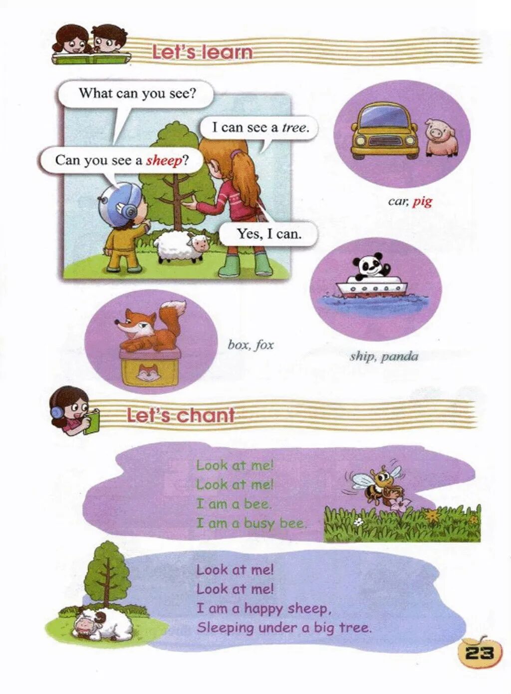 Let's chant一起唱歌谣Look at me!看着我!Look at me!看着我!I am a bee.我是一只蜜蜂。I am a busy bee.我是一只忙碌的蜜蜂。Look at me!看我!Look at me!看着我!I am a happy sheep.我是一只快乐的羊。Sleeping under a big tree.睡在一棵大树下。