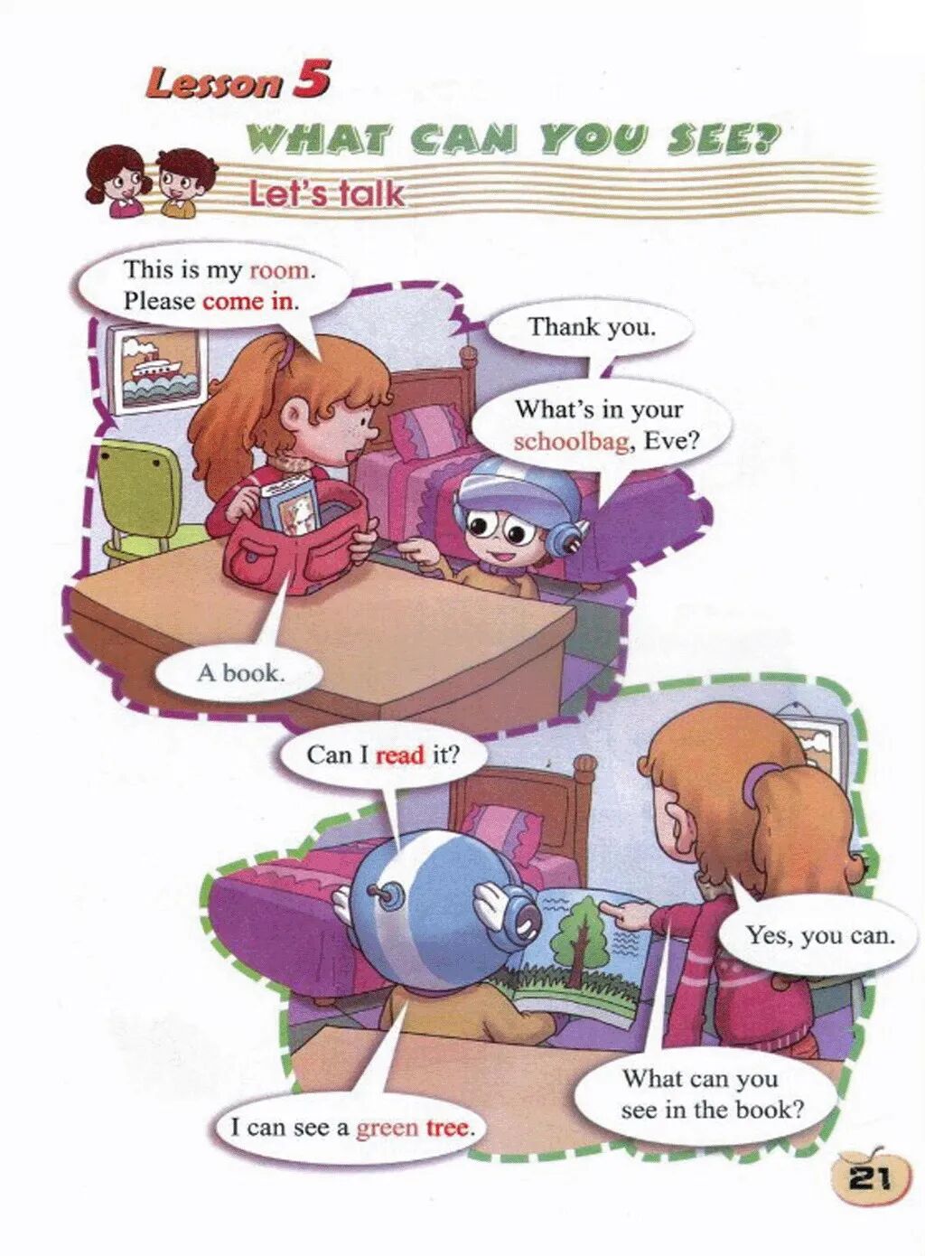 Lesson 5WHAT CAN YOU SEE?第五课你能看到什么?Let's talk看图学说话This is my room.这是我的房间。Please come in.请进。Thank you.谢谢。What's in your schoolbag, Eve?你的书包里有什么,伊芙?A book.一本书。Can I read it?我能看看吗?Yes. You can.是的,你可以。What can you see in the book?你能在书里看到什么?I can see a green tree.我能看到一棵绿树。Can you see any birds?你能看见鸟儿吗?No, I can see four bees.不,我能看见四只蜜蜂。They are black and yellow.它们是黄黑相间的。Can you see a pig?你能看见一只猪吗?Yes, I can.是的,我看到了。And I can see a ship, too.我还看见一艘轮船。A ship?一艘轮船?No, it's not a ship.不,那不是轮船。It's a sheep.它是一只绵羊。Oh yes!哦,是的!Let's learn一起学一学What can you see?你能看见什么?I can see a tree.我能看见一棵树。Can you see a sheep?你能看见一只绵羊吗?Yes, I can.是的,我看见了。