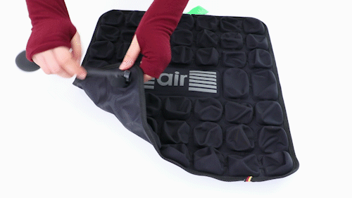 这是由于当气囊受挤压时,气体间相互流动,产生均匀加压的“反重力效果”,可缓冲垂直压力,大大减轻入座时尾椎的负荷和压力。同样的水杯,同样的玻璃板;拽动玻璃板时,下面垫了减压坐垫的杯子明显震动更小。同时也可以明显感受到上半身的重力被垫子传导出去了。