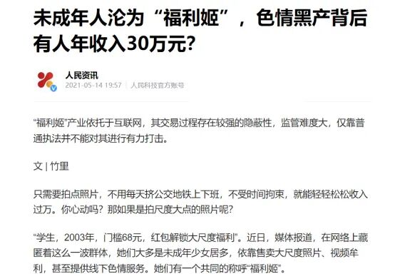 @人民资讯《未成年人沦为“福利姬”,色情黑产背后有人年收入30万元?》@新京报官微《未成年人沦为“福利姬”?黑色产业链需“打早打小”》@全国妇联女性之声《童装成人化现象调查:女童服装,何必如此性感暴露》End