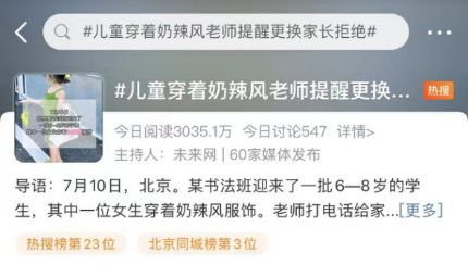 看到这样一套穿搭,你的脑海中浮现的,或许是一位大尺度穿衣的“妖艳女子”。然而,如果我告诉你,这套在网络上被称之为“奶辣风”的穿搭,出现在了一名小学女生身上,你又会作何感想?最近,在北京的一家书法班里,就真的有这样一幕冲上热搜。在一群6到8岁的新学生里,这一套对成年人来说都相当性感的穿搭,就这样堂而皇之地出现在一位小学女生身上。相信每一个有正常审美的成年人,不论有没有孩子,都不会觉得这套衣服适合孩子穿,更不要说穿出门外,参加兴趣班了。书法班的朱老师见状也觉得不合适,于是赶快致电家长,好言相劝,希望其能给孩子重新换一套服装。不料,女孩的家长却对这个建议不以为然,甚至还回怼了朱老师。他们美其名曰这叫穿衣自由,就连小女孩自己都说,这样穿能够显腿细长。好一个“穿衣自由”!见过离谱的家长,没见过这么离谱的家长!要知道,网络上对于奶辣风的定义,就是奶声奶气+性感火辣的穿搭。可一个6到8岁的女孩子,性别意识都才刚刚觉醒,就算知道爱美,也不会懂得何为“性感”和“火辣”。孩子穿什么衣服,很大程度上都取决于家长的选择,又哪来什么“自由”可言?说白了,所谓的“奶辣”穿搭,根本上其实就是家长出于炫耀和吸引眼球的目的,打着穿衣自由的旗号,让一个个满脸童真的小女孩,穿上一套根本不合时宜的成熟装扮,散发出根本不该属于她们的成熟气息。家长是高兴了,他们的审美也得到了满足,可他们不知道的是,这样的行为,实际上是对孩子的一种“性化”。性化,顾名思义,也就是强行把性感的概念加诸于儿童。这并不是小众群体的狂欢,在各个网络平台上,同样可以看到很多家长分享自己给孩子设计的“辣妹穿搭”。甚至,他们还让孩子在镜头前做出各种意味不明的动作,以此来吸引眼球。看完这些图片,我不禁发出了和那位书法班朱老师一样的感叹:作为两个孩子的父亲,我根本无法将热辣、性感等诸多词汇,与一个天真无邪的孩子联系到一起。在微博热搜下的评论区里,也有无数网友发出了自己的质疑。网友们的评论可谓是一针见血,在这些性化儿童的现象里面,像“奶辣风”这样的词被创造出来本身就是一种扭曲,它就不应该出现在儿童身上。他们只是不断地给孩子穿上奶辣风的性感衣物,在性化儿童的歧路中不断下坠,一步步剥掉孩子的童真。抵制性化儿童,把童真还给孩子,在当下已然成为了一个足够引起我们警惕和重视的话题。比起家长的日常分享,更可怕的是,这股“性化儿童”的风气,早已经偷偷摸摸地潜入了各个领域。比如汽车行业,前几年的“中国国际少儿车模大赛”上,就出现了很多儿童比基尼车模。这些孩子,甚至还没有汽车高,就已经在家长的影响和主办者的默认下,穿着裸露大片皮肤的衣服走秀,做着各种与年龄不符的动作,看得实在让人脊背发凉。而与此同时,很多嗅到了商机的商家,也开始像闻到了腐臭味的秃鹫一样蜂拥而至,继续在性化儿童的大火上浇上热油。他们借着“奶辣风”在家长之间的流行,让童装模特们摆出各种成人的动作,把“性感”和童装这两个八竿子打不着的东西挂钩,吸引家长购买。展示商品,真的需要童装模特做出翘起臀部、掀起裙子这样充满性暗示的动作吗?更恶劣的,是一些视频博主,也借此机会,打起了儿童软色情的擦边球。一开始,他们拍的还是正常的家庭正能量视频,但并没有什么热度。于是,那个父亲就开始让女儿穿上“纯欲”的衣服,在镜头前做出舔奶油、吐舌头、撩头发各种暗示意味的动作,拍摄女儿睡觉时的姿态,一下就找到了“流量密码”。甚至,他还在镜头前直接把女儿抱在身前,强行分开她的双腿,还配上了“拍这个视频的都火了,为啥我就火不了”的文字。我真的很难想象,一个父亲竟会如此丧心病狂没有底线,利用女儿拍摄这种引起正常人极度生理不适的画面。“奶辣风”这样畸形审美的症结,基本上都出现在家长身上。很多被“性化”的孩子,并不是自己学会了那些成熟的穿着打扮和神态动作。她们的背后,站着的往往是那些别有用心的,或是干脆为了展示孩子“好看”而夺走孩子选择权的父母。比如那个12岁女孩的父亲,在网友质疑他时,他却大言不惭地说“这样来钱快”、“黑红也是红”......比如很多家长在发出自己孩子“奶辣风”穿搭的照片被网友怼了之后,还要拿“违背穿衣自由”那一套说辞出来辩解。可是,将自己成年人的审美,强行安排在孩子的身上,把他们的身体变成流量密码和炫耀展品,这根本不叫穿衣自由,而是控制欲和贪婪在作祟。的确,儿童和成人一样,也爱美的东西,爱穿漂亮衣服,但儿童的美丽绝不是成人化的性感热辣。她们明明也有着自己的审美,有着自己的社交圈子,作为父母,我们要做的,应该给她们积极、正向的引导,在保护她们童真的同时也保护她们的安全。可一些家长的盲目跟风,以及为了短期利益故意性化孩子的行为,不仅仅是粗暴地干涉了孩子自由选择的权利,更是在无形之中,把孩子丢进了不属于他们的世界,直面成年人世界的龌龊和黑暗。“奶辣风”这样畸形的审美,对孩子最大的危害是什么?首先,最可怕的,就是可能会让孩子遭到变态恋童癖的骚扰。影史经典《这个杀手不太冷》中,13岁的娜塔莉波特曼因为饰演玛蒂尔达一炮而红。然而,正是因为她在电影中过于成熟的扮相,引来了一群龌龊的