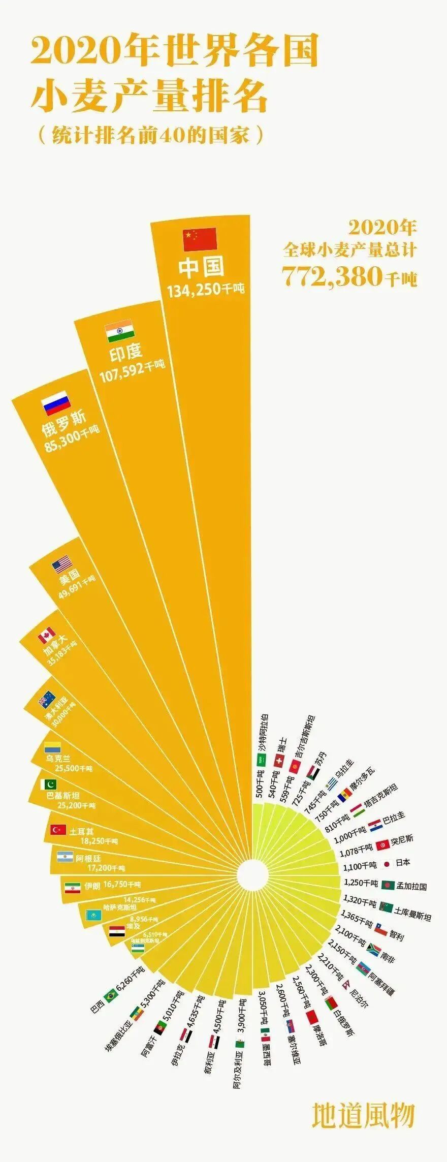 2020年世界排名前40的小麦产量国家,中国排第一,占世界小麦总产量的17.38%。 数据来源:NBSC。 制图/刘航