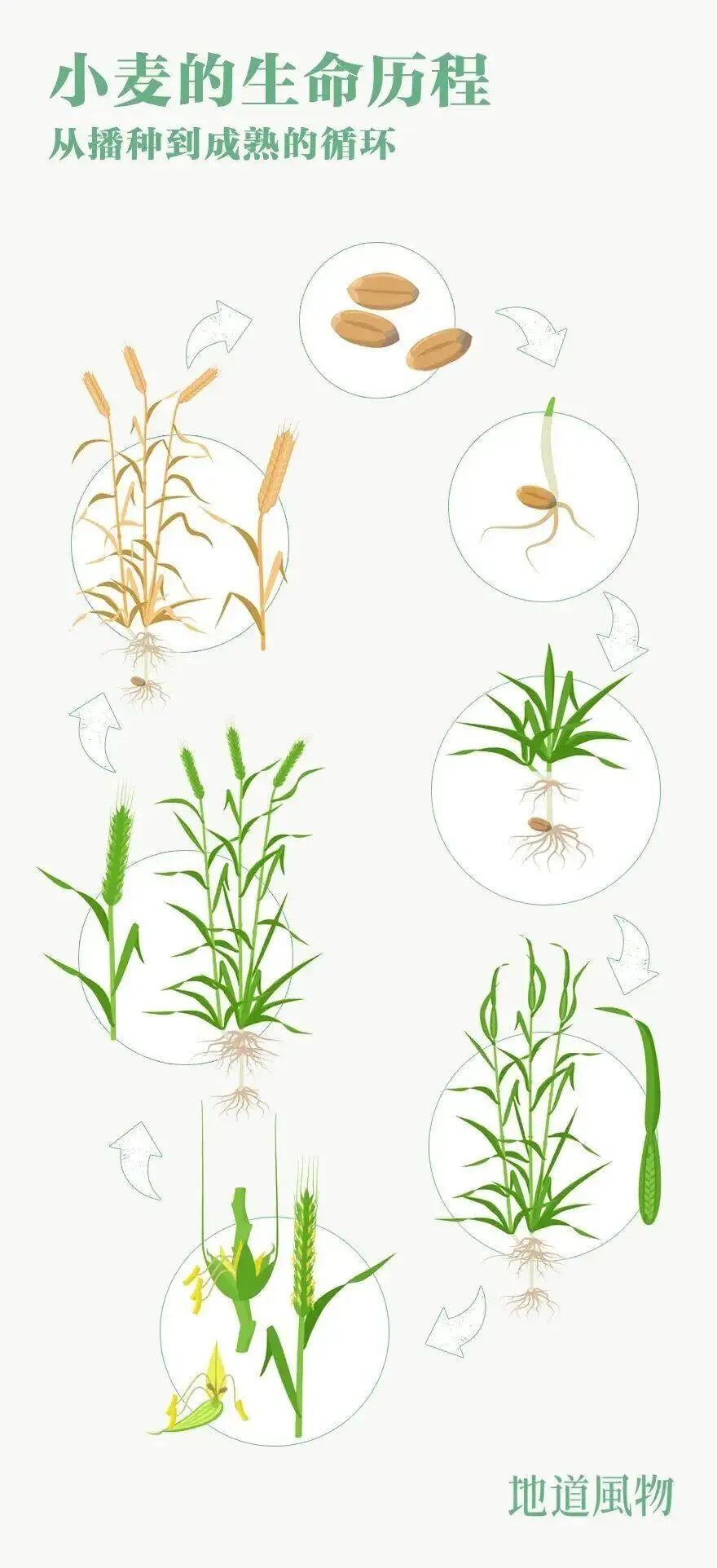 小麦一生会经历种子萌芽、出苗、生根、长叶、拔节、孕穗、抽穗、开花、结实,到产生新的种子;小麦从播种到成熟一般需要230~270天。 制图/刘航